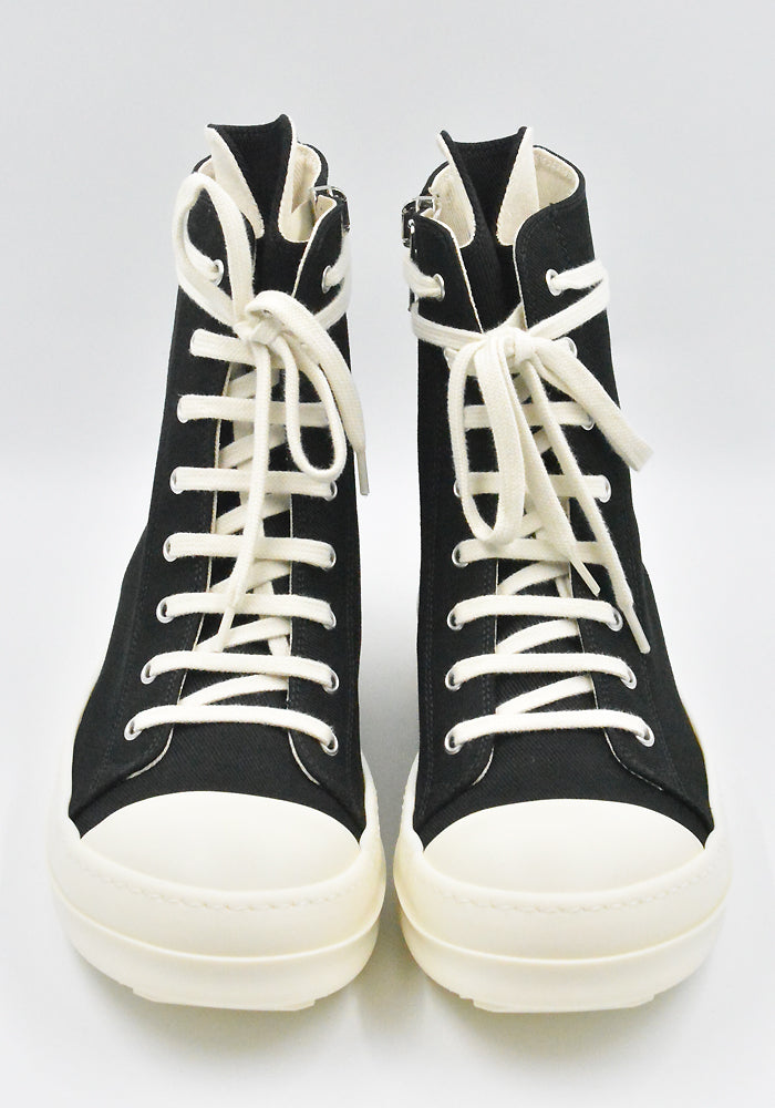 Hi-top sneakers featuring a black cotton canvas upper, above ankle height, 8 eyelets with white laces, a round toe and white shark tooth rubber sole from Rick Owens Drkshdw 2026SS Collection.
