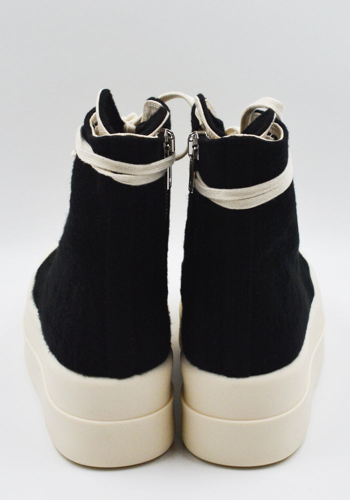 Above ankle height, Mega bumper sneakers in black brushed cotton features 8 eyelets with white laces, a round toe in white rubber and white shark tooth rubber sole from Rick Owens Drkshdw 2025FW Collection.