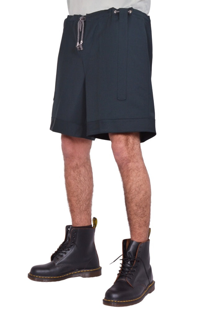 Men's shorts in scarab color wool blend features a drawstring at waistband with custom beads and leather-reinforced eyelets from KIKO KOSTADINOV 2026SS Men's collection.