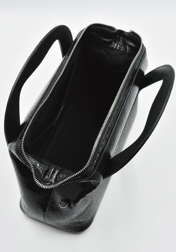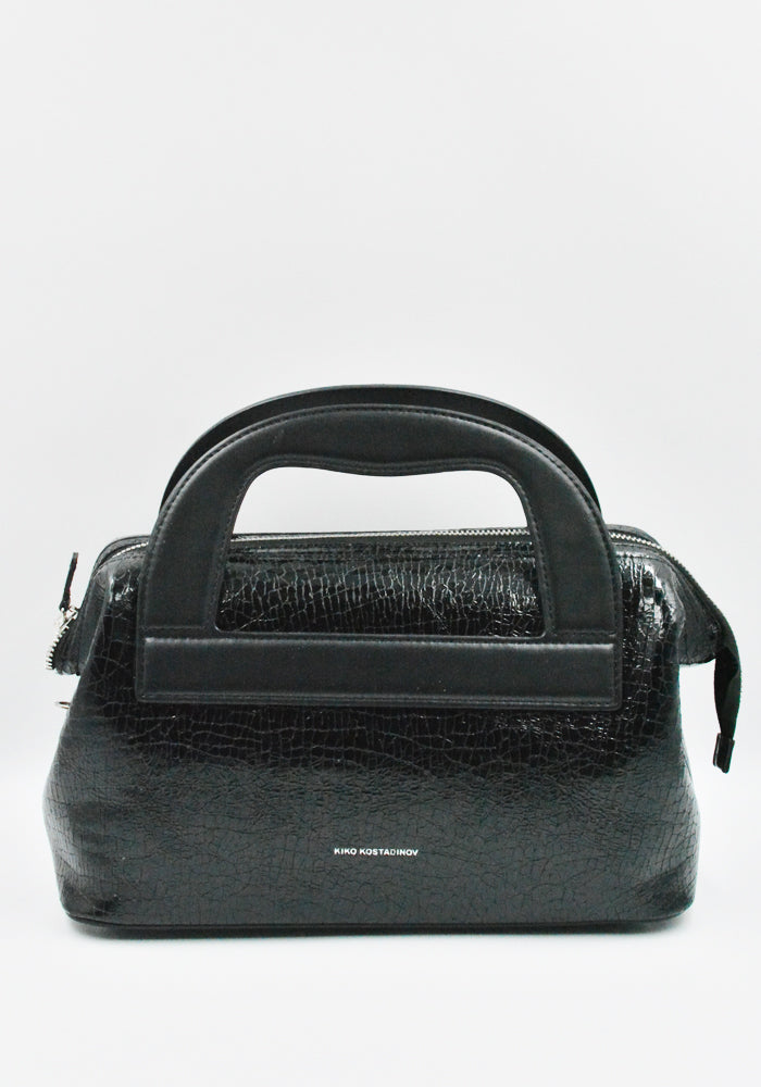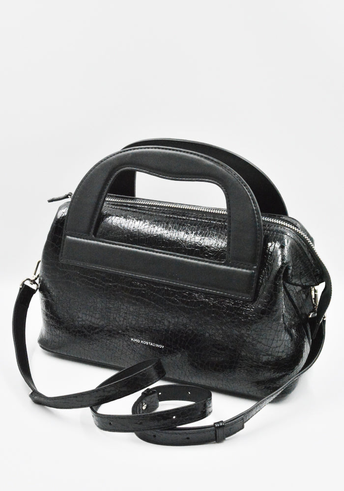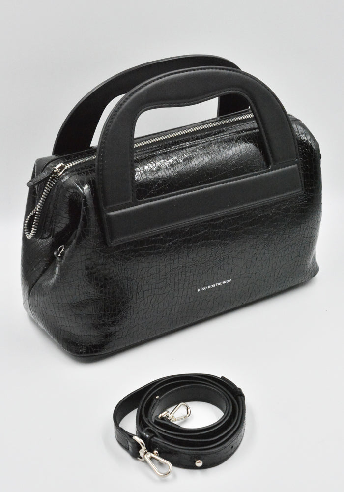 Women's Isadora bag in cracked black patent calf leather features twin top handles and a detachable shoulder strap from KIKO KOSTADINOV 2025FW Women's collection.