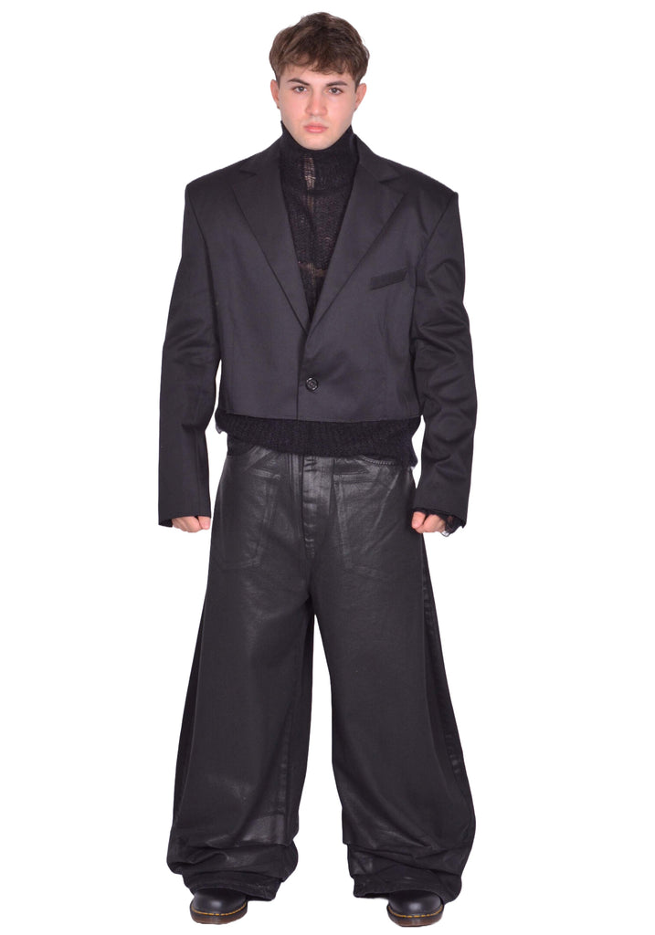 Cropped tailored blazer in black features a notched lapel, padded shoulders, long sleeves with a buttoned cuffs, single breastred and one button front closures from LU'U DAN 2025FW Collection.