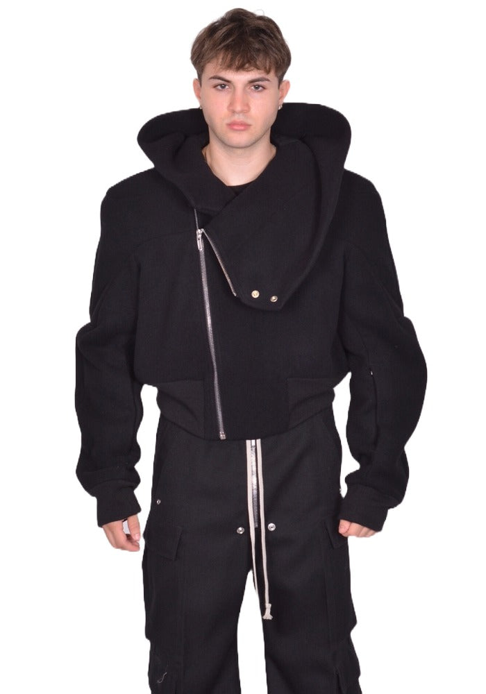 Men's cropped hooded flight jacket in black new wool features an asymmetric zip front closure, a big hood with snap buttones closure, dropped shoulders and  long sleeves  from Rick Owens 2025FW "concordians" Collection.