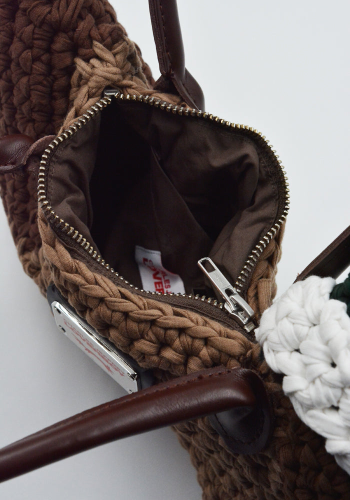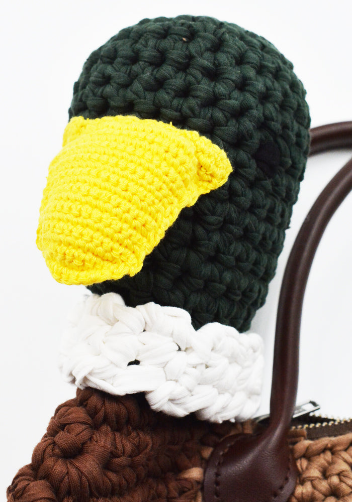 Duck shaped handbag in cotton crochet features a double leather handle, top zip closure, cotton lining and brand logo tag at front from Charles Jeffrey LOVERBOY 2025SS collection.