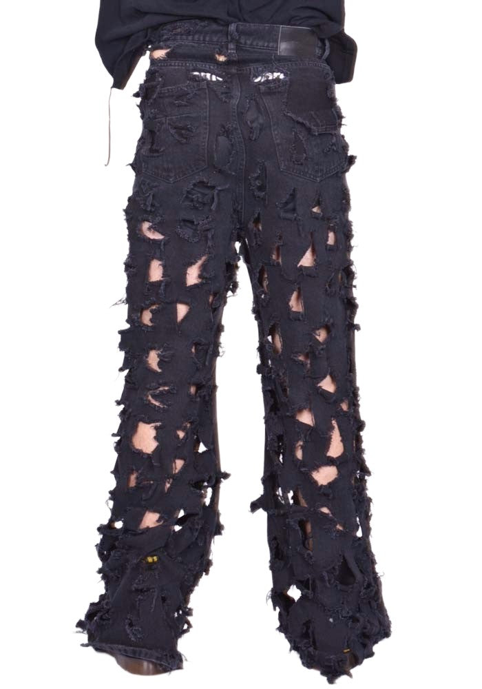 Unisex, Destoyed denim jeans in washed black cotton features a zip front with a top button closure, mid-rise, wide legs and distressed holes finish all-over from MATIERES FECALES 2025FW collection.