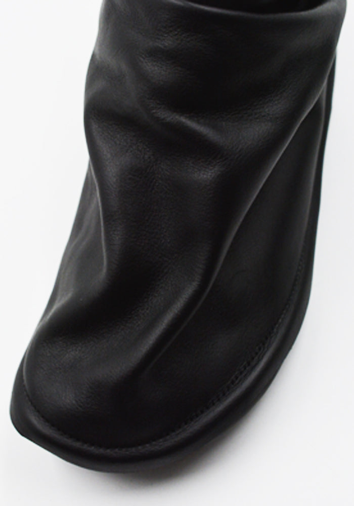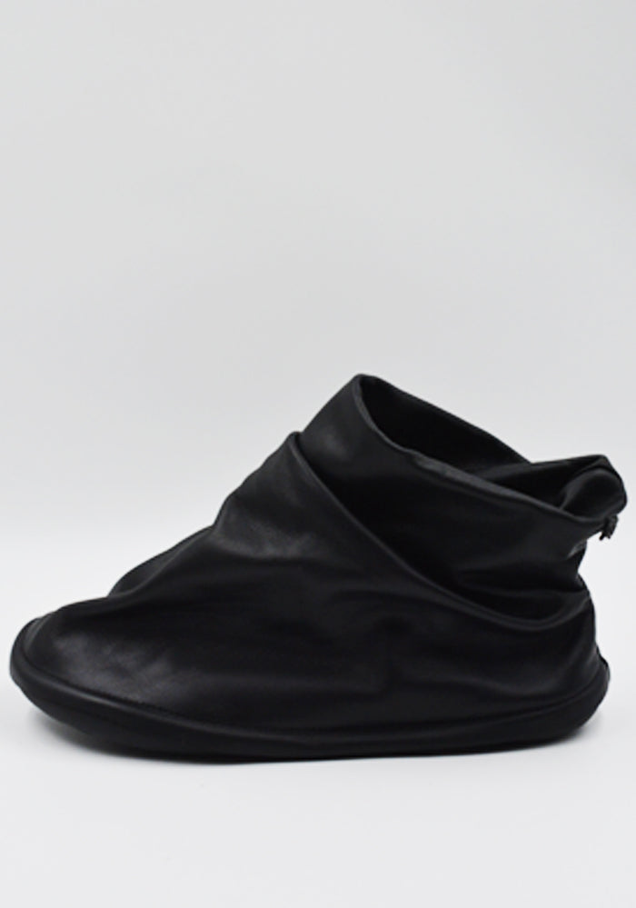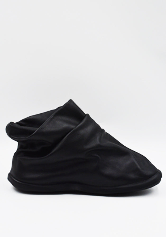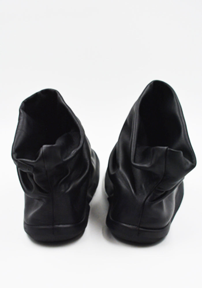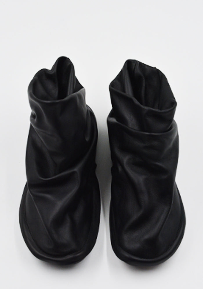 Men's draped ankle boots in black calfskin with EVA footbeds and TPU outsoles (20% recycled) from Camper x Issey Miyake collaborationcollection.