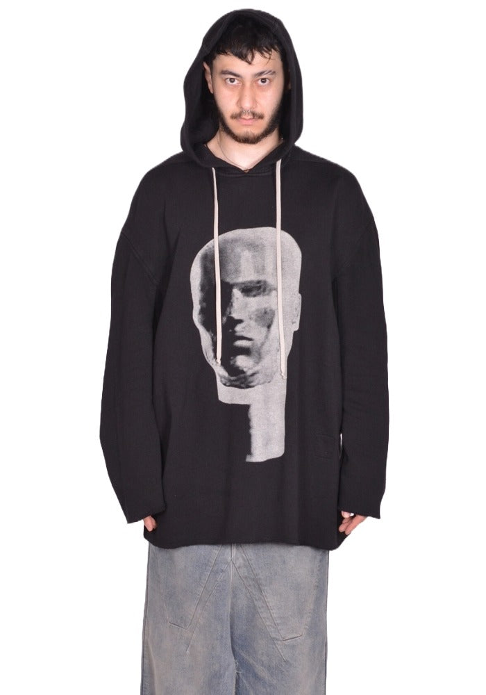 Men's oversized sweat hoodie in black cotton fleece features a drawstring hood, a graphic print at front, longe sleeves, raw egde cuffs and hem line from Rick Owens Drkshdw 2025FW Collection.