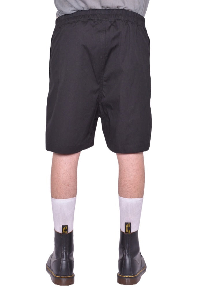 Men's boxers shorts in black stretch cotton features an elastic waistband with a drawstring closure, above knee length length and side slits from Rick Owens 2025FW "concordians" Collection.