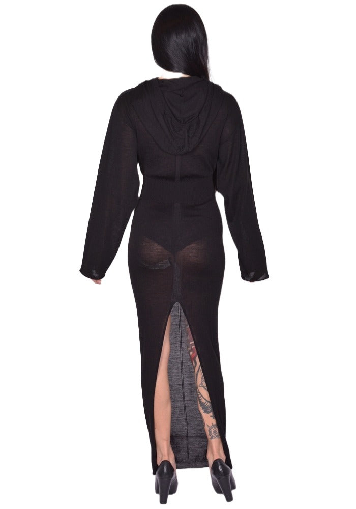 Maxi knit dress in black new wool features a large hood, drop shoulder, long sleeves with rolled edge cuffs and a deep back center slit from Rick Owens 2025FW "concordians" Collection.