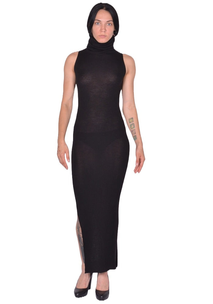 Tube maxi dress in black new wool ribbed knit features a turtle neck, sleeveless, and a deep slit at side seam from Rick Owens 2025FW "concordians" Collection.