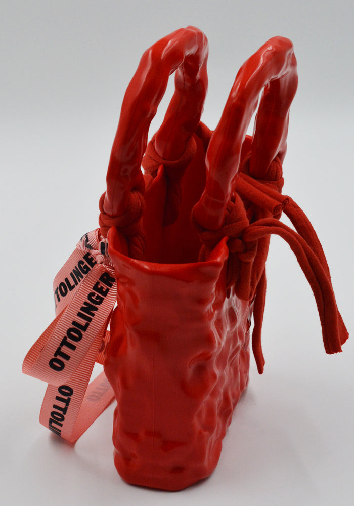 Small tote bag in red handcrafted recycled rubber features an open top, double top handle, red bows and logo printed pink ribbon at handles from Ottolinger 2025FW collection.