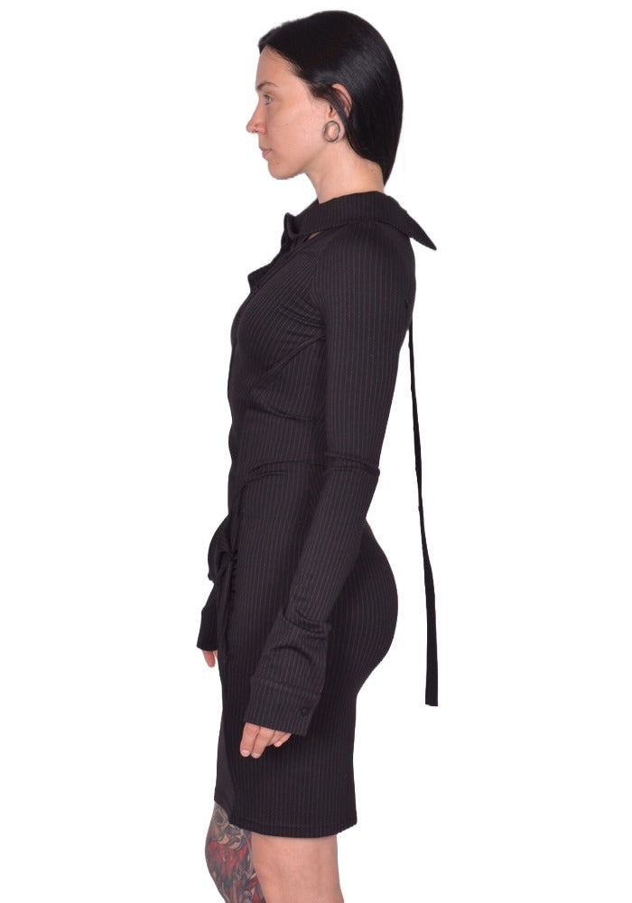 Asymmetric mini dress in black pin stripe jersey features an asymmetric collar, Off-center four buttons placket, long sleeves with buttoned cuffs and multi straps detail from Ottolinger 2025FW collection.