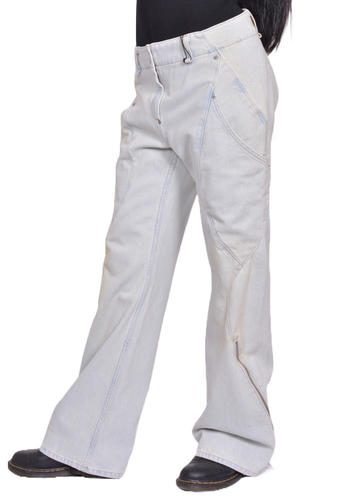 Carina Flared Jean features the same postal stamp artwork across light indigo non-stretch denim. The design includes a transformative godet zipper detail at the hem, when unzipped the bottom hem opens to create a loose, flared silhouette, allowing the wearer to alter the garment's fit and attitude. Additional details include double side pocket entries, two center front snaps at the waistband, an exposed rivet at the bottom fly, one back pocket with zipper closure, and trapunto stitching at the back waistband - ensuring each garment is unique. The light indigo wash offering of the jean features the same construction details - double snap waistband detail and front zipper opening - rendered in light indigo with specific tinted placements across non-stretch denim.