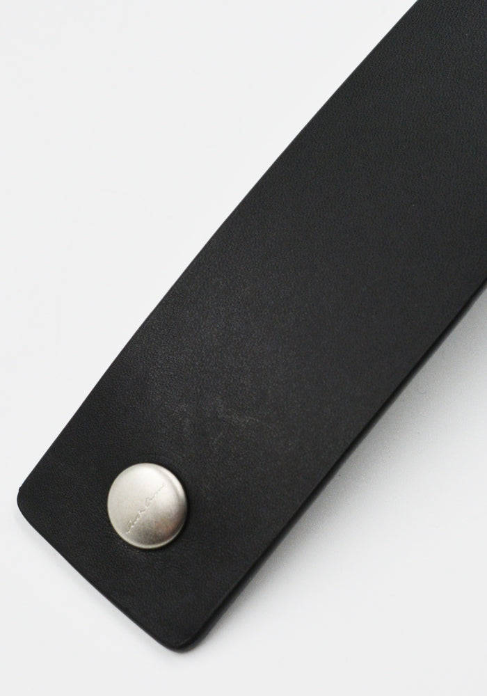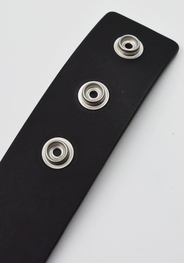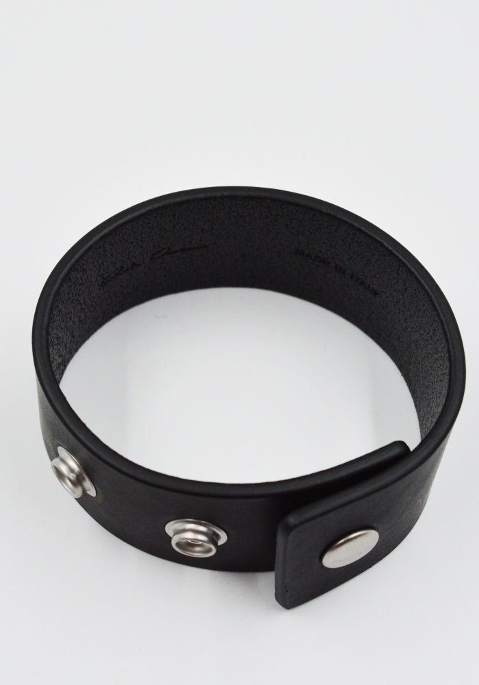 Wide bracelet in black bull leathter that wrap around the wrist with a snap button fastening from Rick Owens 2025FW "concordians" Collection.